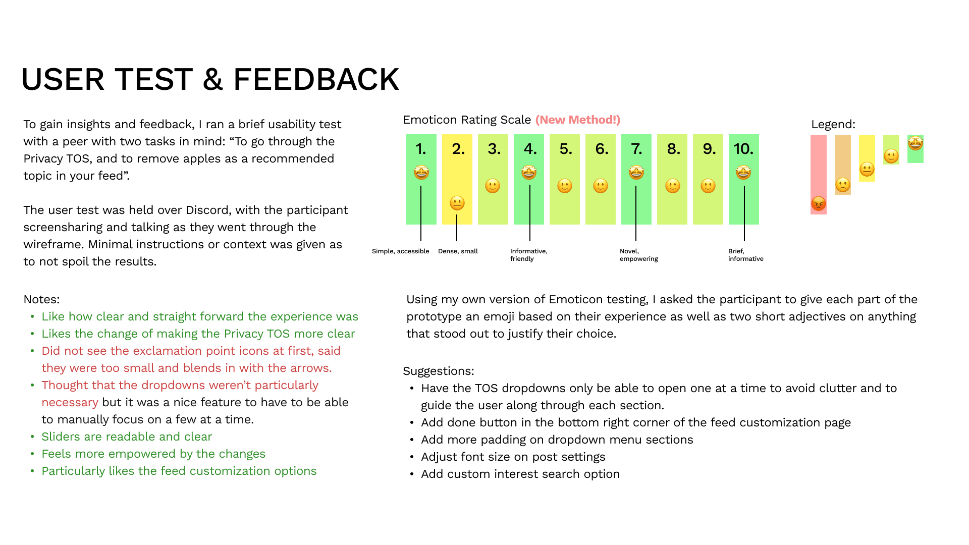 Different user testing methods were practiced when testing the different stages of the prototype (alongside general user testing). These methods include: Five second test and Emoticon scale. These methods helped debug and test usability, feasibility, flow, and clarity allowing me to iterate and improve the design over the course of the four week project in order to deliver a refined project reflective of user wants and needs.