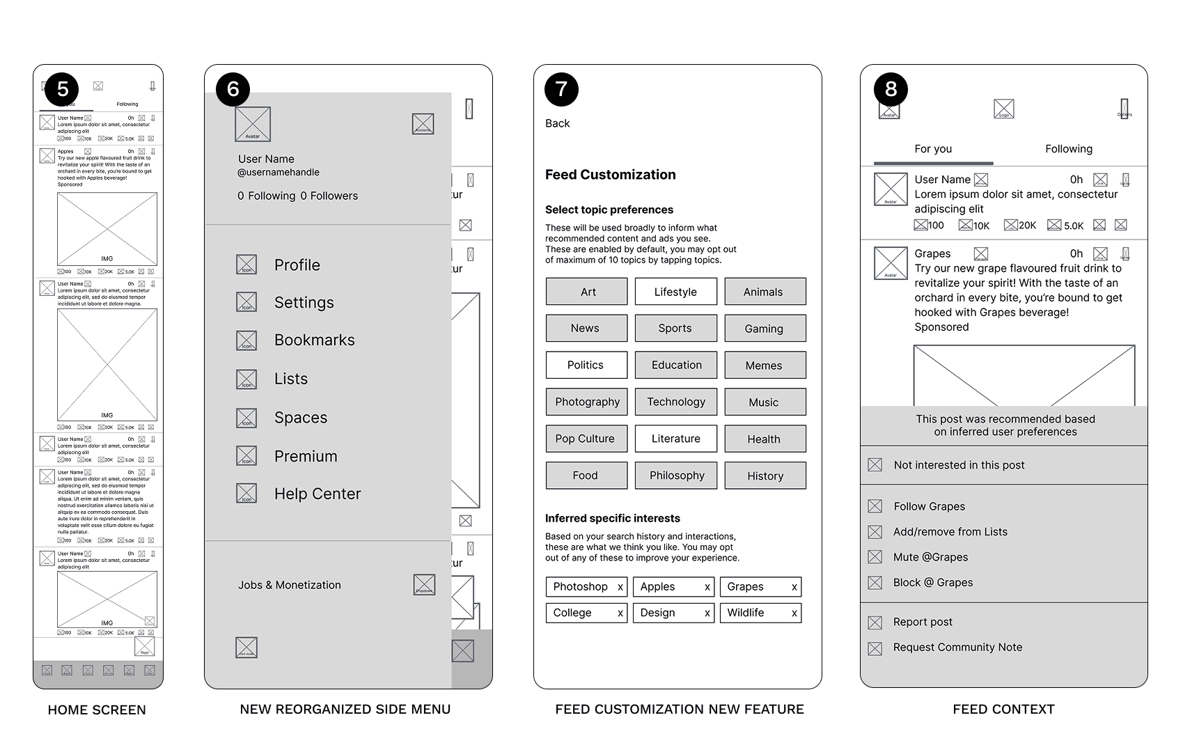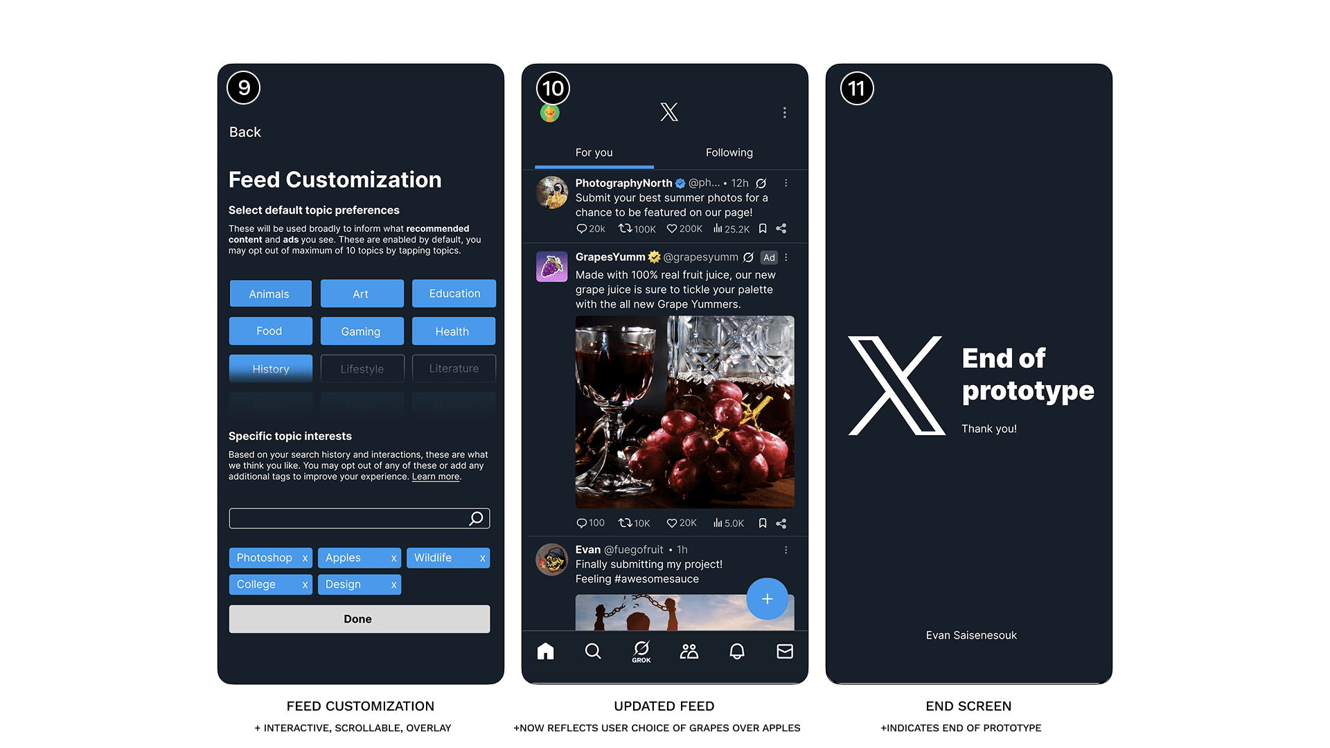 The prototype follows a single User Journey scenario where the user opens the app after the hypothetical patch update and edits their feed to feature Apples instead of Oranges. This effectively shows off each of the changes proposed and was iterated upon after several rounds of User Testing. The experience was designed to empower users and give them the tools to customize their experience transparently and not buried.