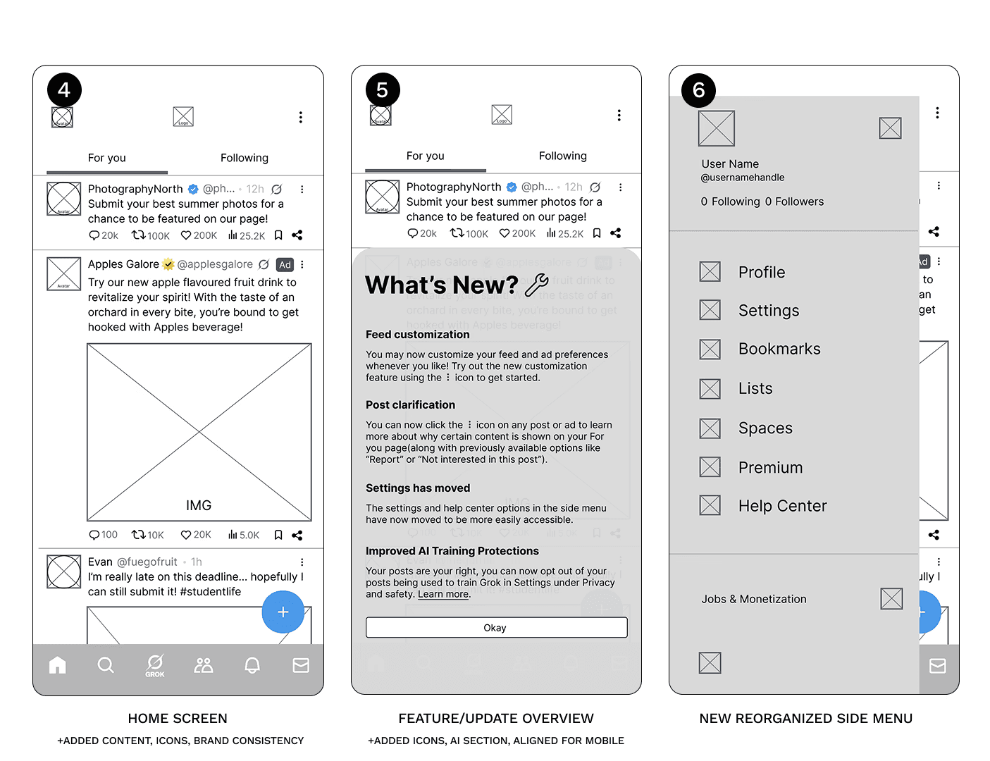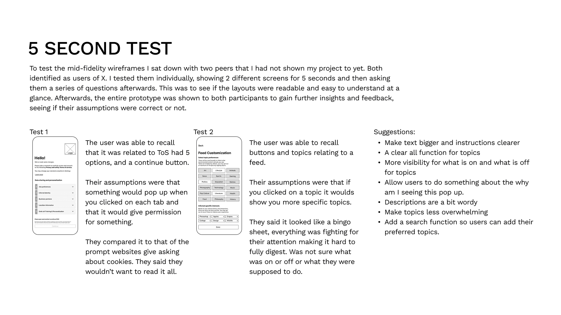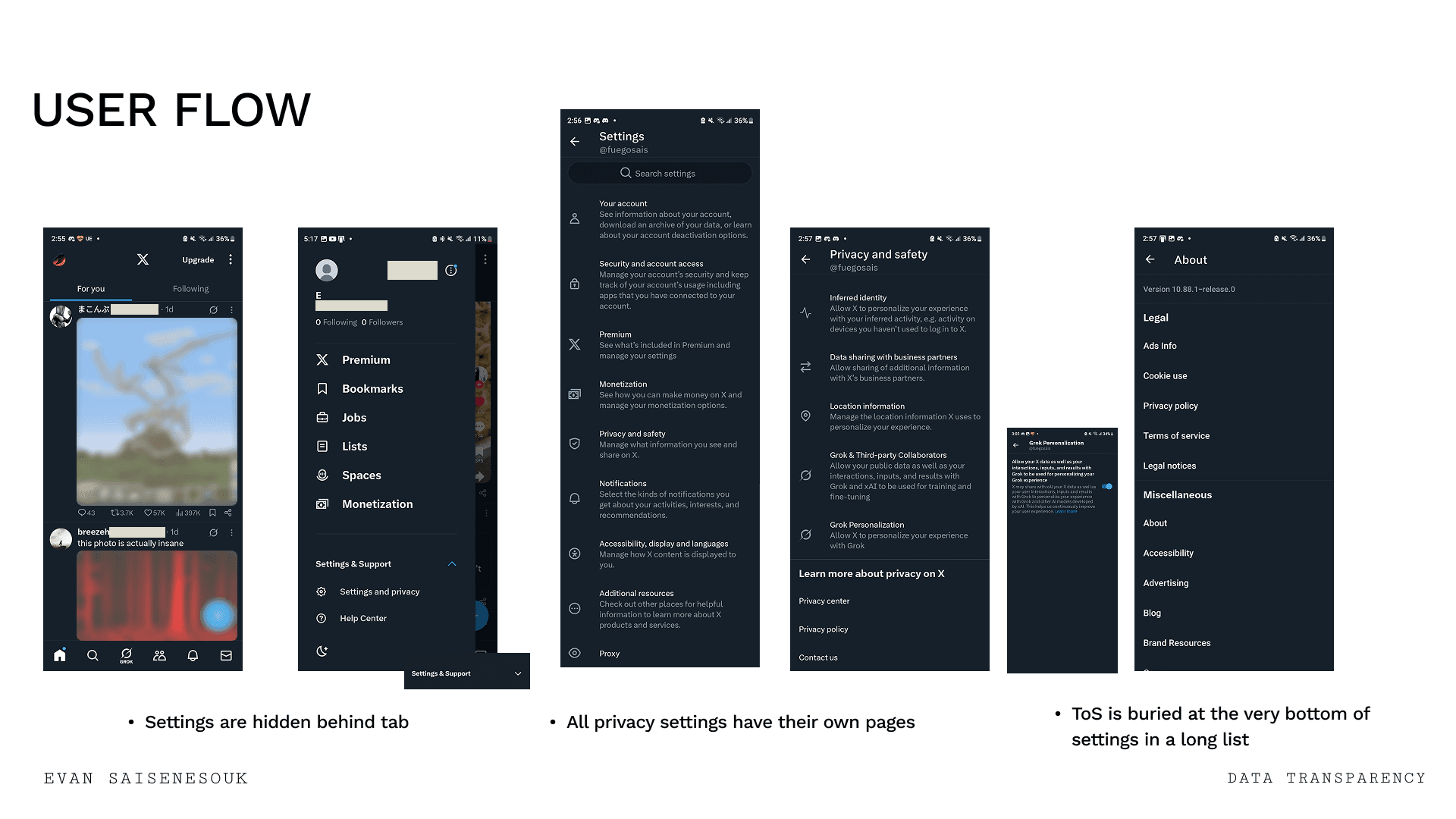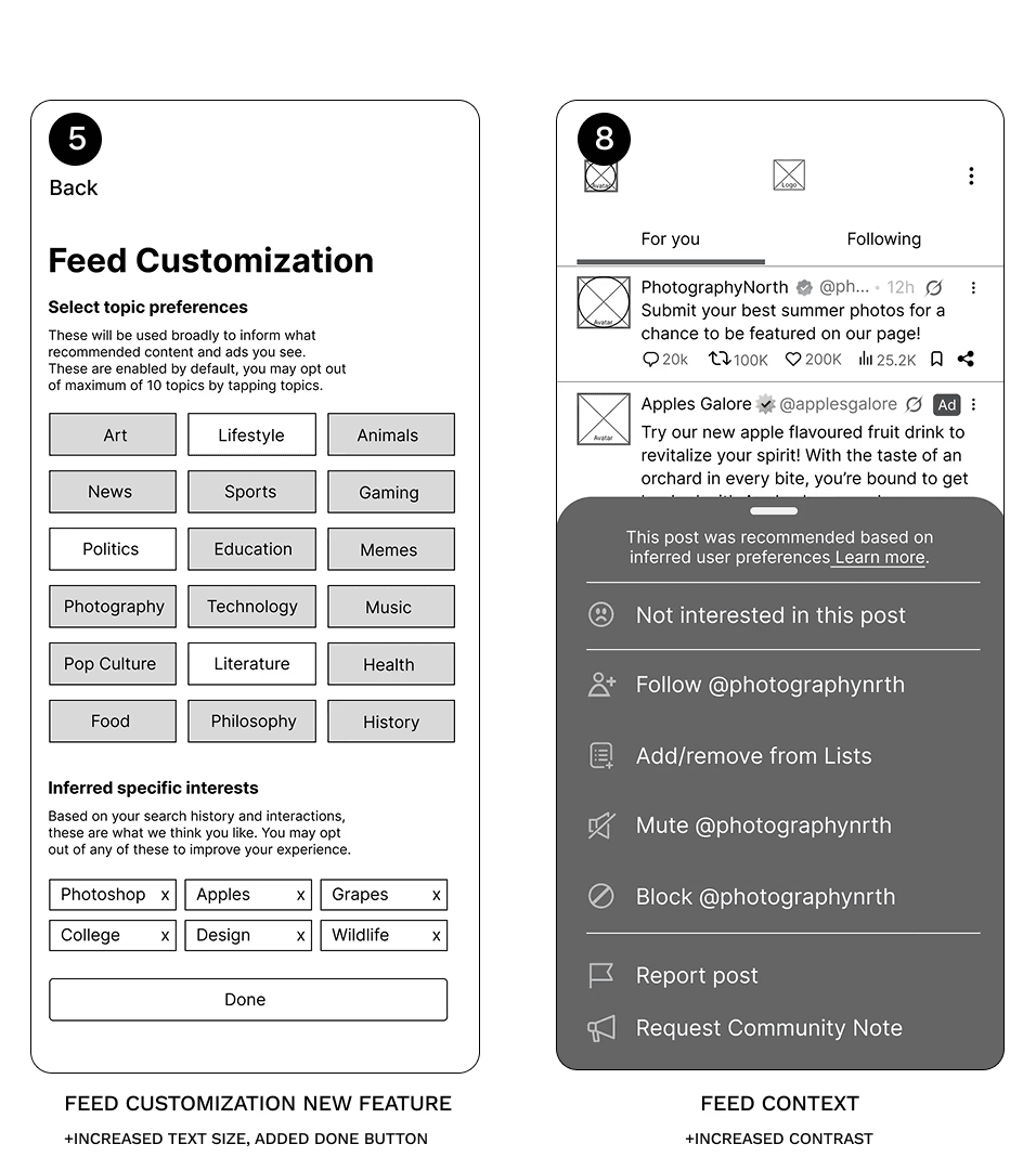 To start I took screenshots of the app and documented the current user flow of completing “problem area” tasks defined by the survey results. Such as finding the TOS, or removing unwanted posts and topics from their feed. I also took some time to look into other similar platforms like Bluesky to get some inspiration. Then, I began production of low fidelity, mid fidelity, and high fidelity interactive prototypes on Figma; testing with a variety of methods and receiving feedback from peers and survey participants.