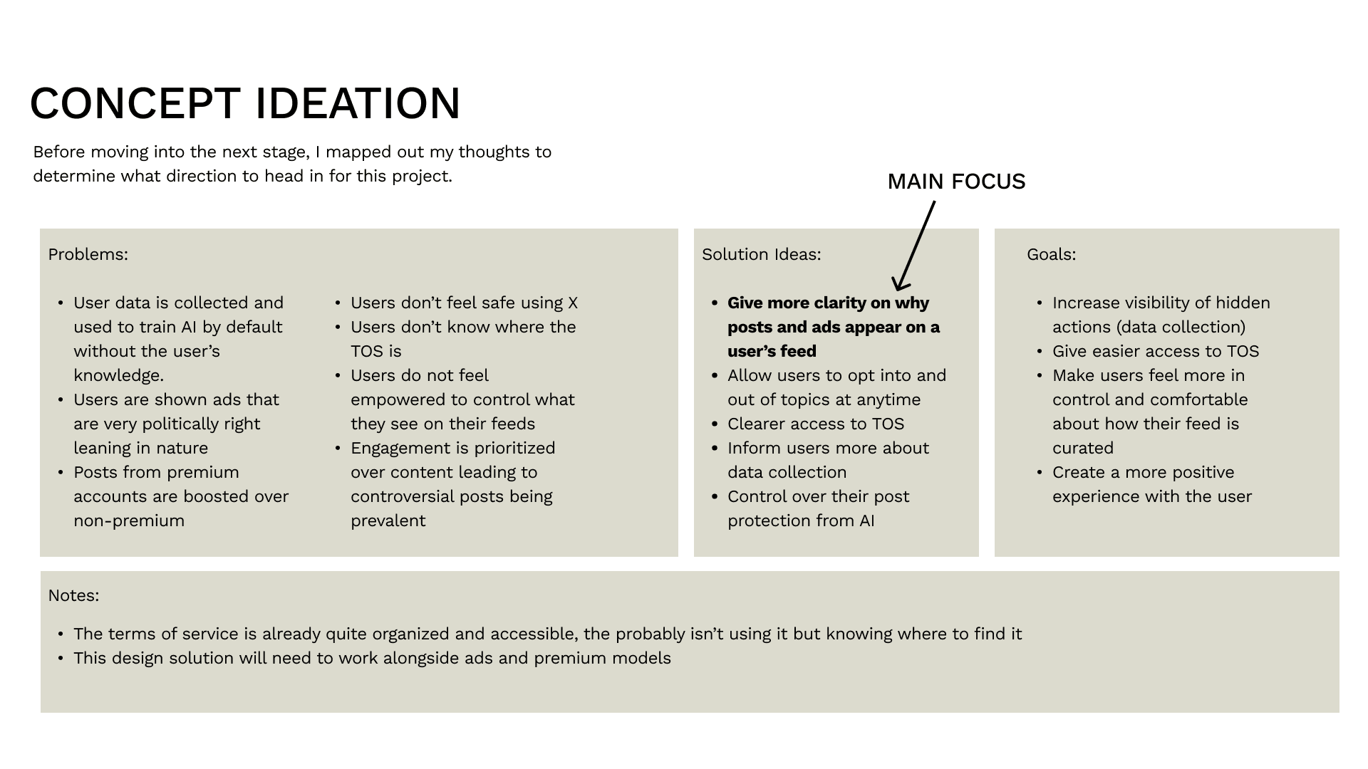 After analyzing the survey data, six key problems were discovered throughout the results. These problems included concerns about AI training of user content, controversial/upsetting feeds pushed by the algorithm, hidden TOS, and more. With these problems, defined, solutions and goals were created to address throughout the project as the through line.